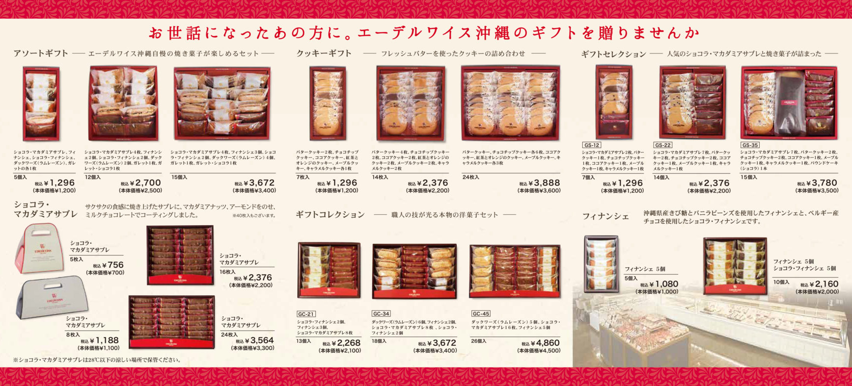 お世話になった方へエーデルワイス沖縄の夏ギフトはいかがですか? ただいま、本店・リウボウカフェ店では焼菓子ギフトを店内にて取り揃えております。 一部リニューアルしたギフト商品もございます。この機会にぜひご利用くださいませ。